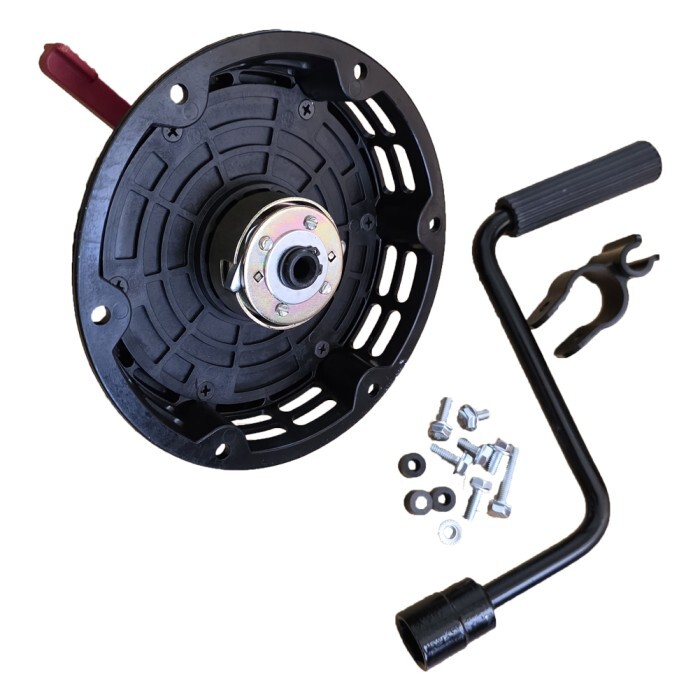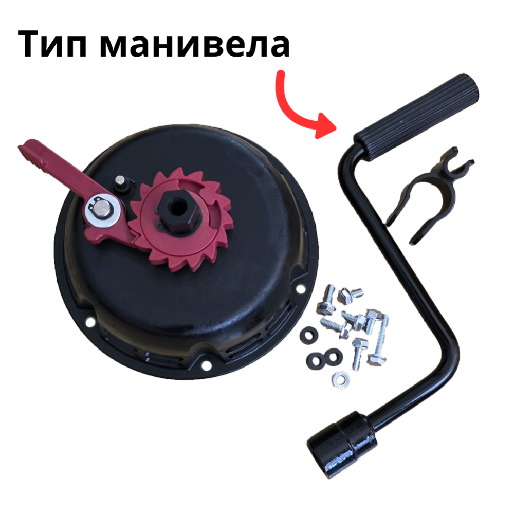Манивелният стартер служи за ръчно задвижване на двигателя чрез завъртане, като осигурява по-лесно палене в сравнение със стандартните стартери с въже. Намалява усилието при стартиране и улеснява работата, особено при по-честа употреба.